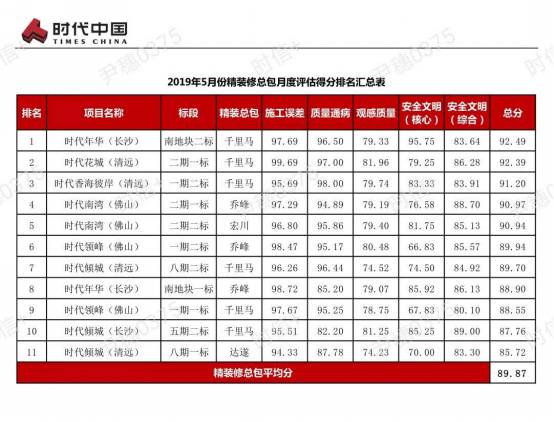 時(shí)代中國(guó)成立于1999年,是在香港上市的總部位于廣州的知名開(kāi)發(fā)商。時(shí)代中國(guó)一直深耕珠三角,輻射全面,年銷(xiāo)售額今年計(jì)劃超千億!對(duì)品質(zhì)要求非常高!對(duì)安全文明施工、實(shí)測(cè)實(shí)量、交付評(píng)估、售后服務(wù)都非常重視。專(zhuān)門(mén)聘請(qǐng)?jiān)跇I(yè)內(nèi)非常嚴(yán)格的第三方評(píng)估公司——深圳市瑞捷建筑工程咨詢(xún)有限公司,對(duì)項(xiàng)目整個(gè)過(guò)程進(jìn)行評(píng)估與監(jiān)督。 深圳千里馬裝飾集團(tuán)本著“專(zhuān)業(yè)鑄造精品,服務(wù)提升價(jià)值”的精神,把客戶(hù)放在第一位,認(rèn)認(rèn)真真抓落實(shí)、認(rèn)真落實(shí)客戶(hù)指令。緊抓“工匠精神”不動(dòng)搖,施工質(zhì)量和現(xiàn)場(chǎng)安全文明施工逐步提升。 作為時(shí)代中國(guó)的精裝修戰(zhàn)略合作供應(yīng)商,我司項(xiàng)目包攬時(shí)代中國(guó)2019年5月月度評(píng)估前三名!可喜可賀,只要我們重視、認(rèn)真,取得好成績(jī)應(yīng)是理所當(dāng)然!恭喜獲得好成績(jī)的項(xiàng)目小伙伴,感謝獲得好成績(jī)的小伙伴,你們?yōu)楣救〉昧藰s譽(yù),公司全體同事以你們?yōu)榘粒? 千里馬裝飾集團(tuán)實(shí)行“奮斗者文化”,急招有志之士加盟千里馬,你的奮斗和付出將會(huì)獲得公司巨大的支持以及豐厚的回報(bào)。 深圳千里馬裝飾集團(tuán)人力資源部,電話號(hào)碼:0755-26756366,千里馬裝飾期待您的加入。