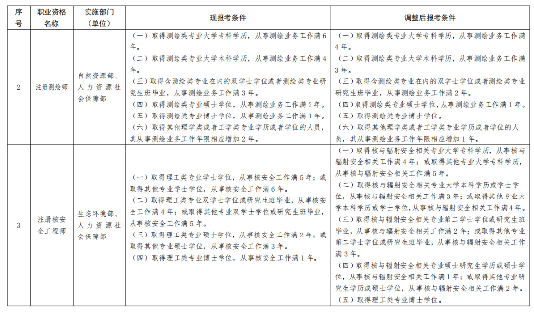 1、《部分準入類職業資格考試工作年限要求調整方案》(見附件)自2022年起實施。除調整考試工作年限要求外,13項準入類職業資格的其他考試報名條件不變。
